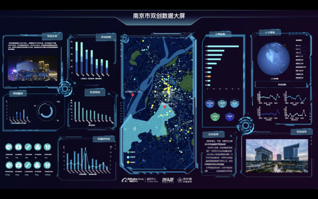 雙創數據大屏是國內首個將雙創發展狀況進行指數化和可視化的大數據服務產品,由阿里巴巴創新中心、創頭條、五葉草共同研發,該大屏的亮點是接入了阿里巴巴的云棲指數、創頭條的雙創指數、五葉草的雙創數據,并采用國內先進的可視化模型和呈現技術,全部數據通過API接口自動化和動態化管理,從而實現了對雙創的數據化管理。