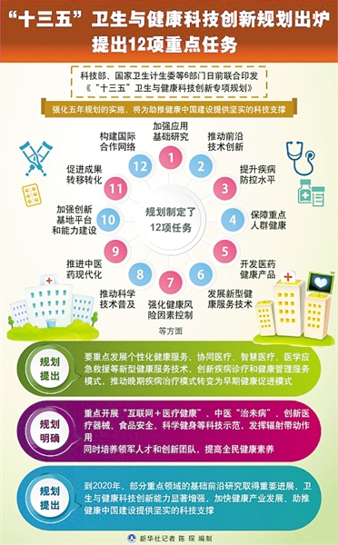 王磊介紹,《規(guī)劃》圍繞健康中國建設(shè)需求,全力推進(jìn)相關(guān)領(lǐng)域科技計(jì)劃(專項(xiàng)、基金等)的實(shí)施,共部署5個(gè)方面的12項(xiàng)重點(diǎn)任務(wù)。