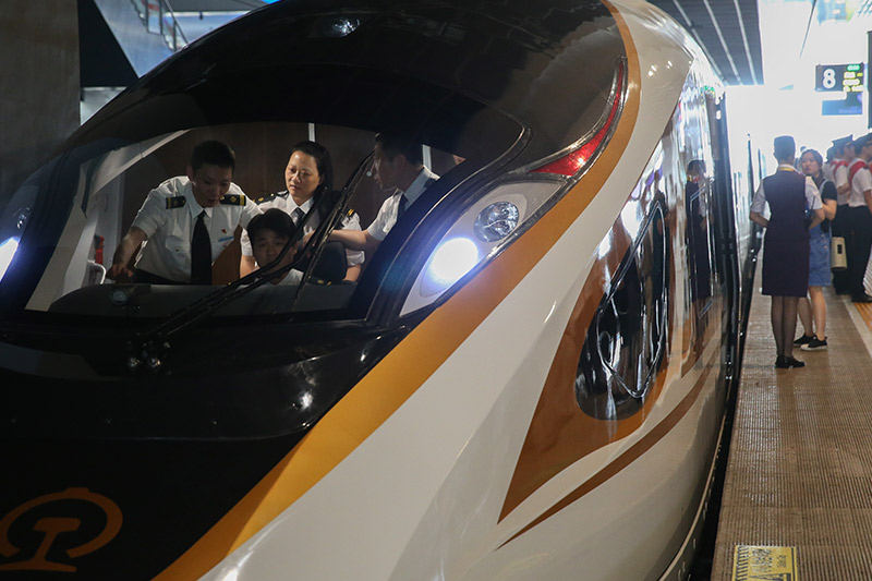 6月26日,在上海虹橋火車(chē)站,工作人員在“復(fù)興號(hào)”G124次列車(chē)駕駛艙內(nèi)進(jìn)行發(fā)車(chē)前的準(zhǔn)備。“復(fù)興號(hào)”是由中國(guó)鐵路總公司牽頭組織研制、具有完全自主知識(shí)產(chǎn)權(quán)、達(dá)到世界先進(jìn)水平的中國(guó)標(biāo)準(zhǔn)動(dòng)車(chē)組。
