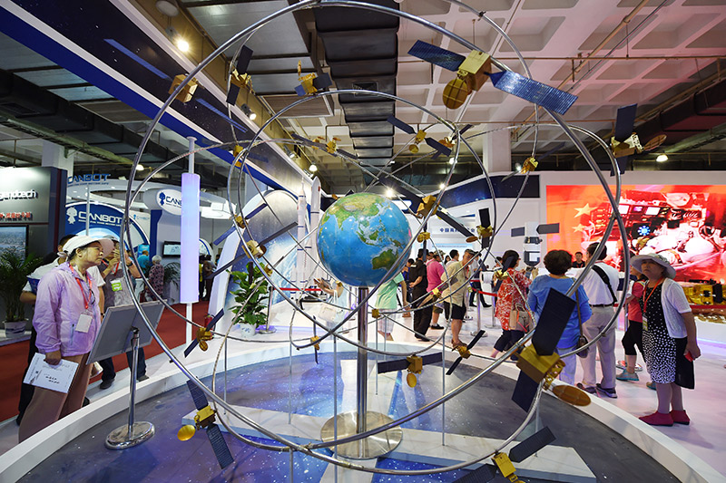 6月9日,參觀者在第二十屆中國(guó)北京國(guó)際科技產(chǎn)業(yè)博覽會(huì)上參觀展出的北斗衛(wèi)星導(dǎo)航系統(tǒng)模型。