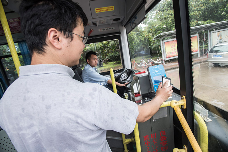6月15日,一名乘客在湖北武漢用手機(jī)刷支付寶搭乘公交車(chē)。