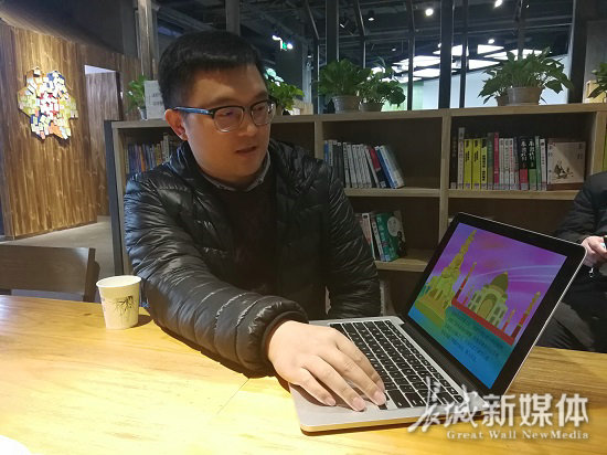 大學(xué)生科技創(chuàng)新創(chuàng)業(yè)項(xiàng)目評(píng)選活動(dòng)一等獎(jiǎng)獲得者代壯博向記者介紹他的獲獎(jiǎng)項(xiàng)目《途趣》。記者閆思宇攝