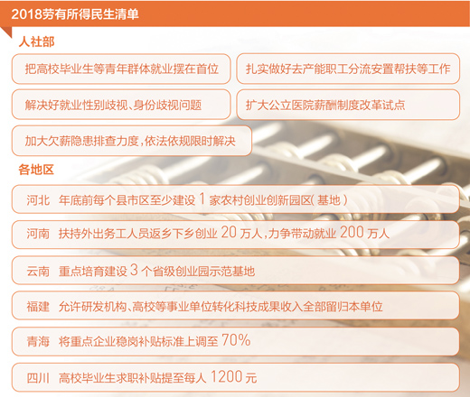 2018年,勞有所得有兜底。青海今年起將重點企業穩崗補貼標準上調至70%。四川高校畢業生求職補貼提至每人1200元。遼寧全省執行新調整后的低工資標準。上海制定欠薪單位“黑名單”……
