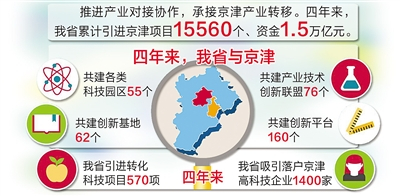我省加強(qiáng)與中關(guān)村、濱海新區(qū)等創(chuàng)新源頭的對(duì)接協(xié)作,借力京津產(chǎn)業(yè)優(yōu)勢(shì)和科技資源,構(gòu)建協(xié)同創(chuàng)新共同體,加快推動(dòng)產(chǎn)業(yè)轉(zhuǎn)型升級(jí)。數(shù)據(jù)顯示,近四年來,我省與京津共建各類科技園區(qū)55個(gè)、創(chuàng)新基地62個(gè)、創(chuàng)新平臺(tái)160個(gè)、產(chǎn)業(yè)技術(shù)創(chuàng)新聯(lián)盟76個(gè),引進(jìn)轉(zhuǎn)化科技項(xiàng)目570項(xiàng),吸引落戶京津高科技企業(yè)1400家。