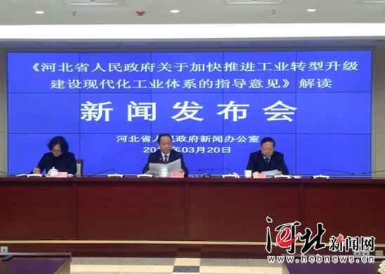 3月20日,河北省政府新聞辦召開新聞發(fā)布會(huì),對(duì)《河北省人民政府關(guān)于加快推進(jìn)工業(yè)轉(zhuǎn)型升級(jí)建設(shè)現(xiàn)代化工業(yè)體系的指導(dǎo)意見》進(jìn)行解讀。圖為發(fā)布會(huì)現(xiàn)場。記者杜昱輝攝