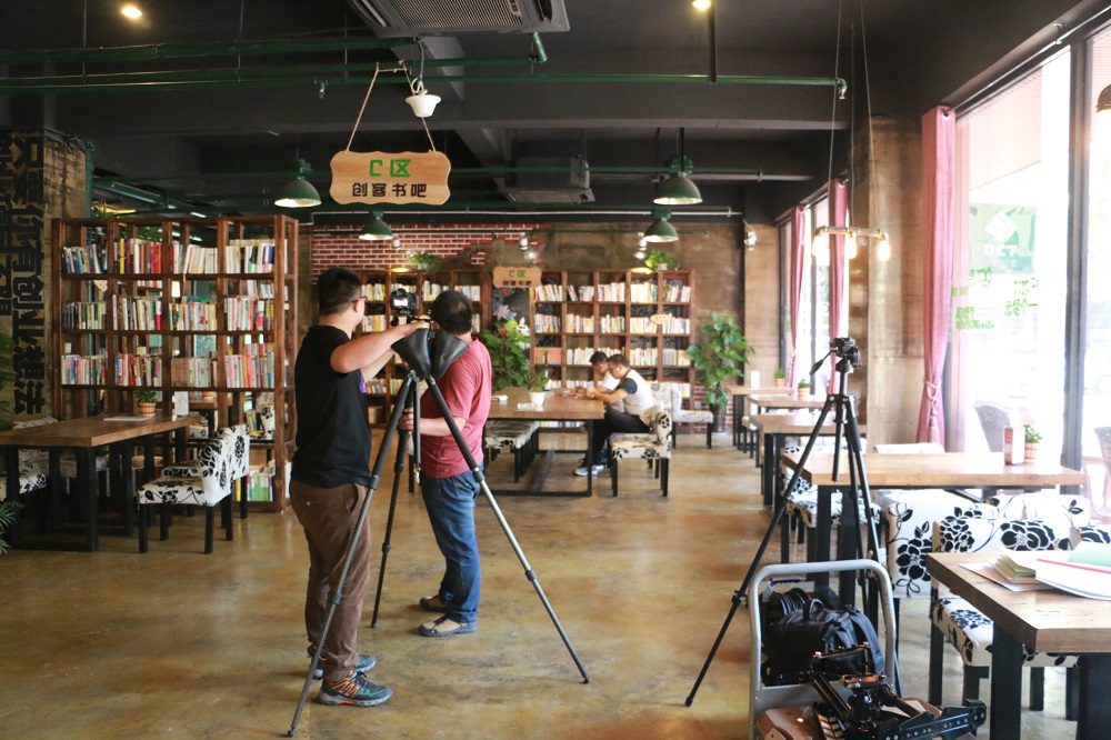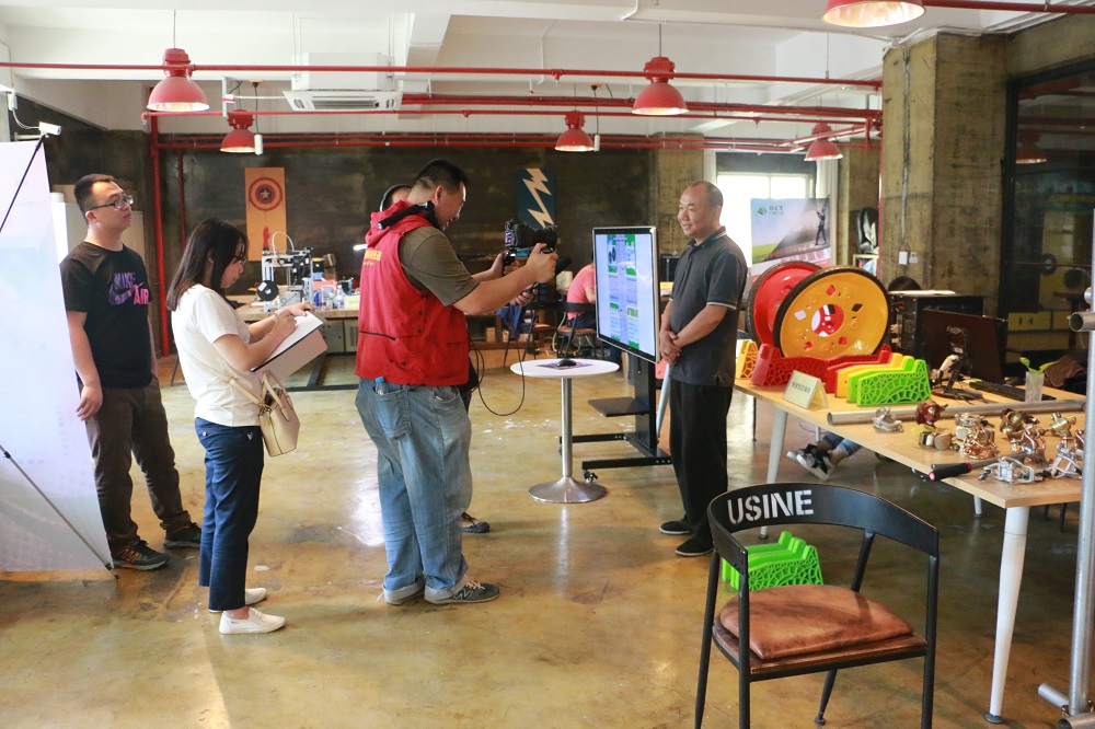 采訪人員首先在DCT創客空間一層創客書吧、項目路演大廳和人才交流展示區進行了拍攝,還采訪了DCT創客空間工作人員周承樸,周承樸介紹了DCT創客空間的服務理念以及今后將更加積極探索優秀的孵化模式,助力更多創客實現夢想。